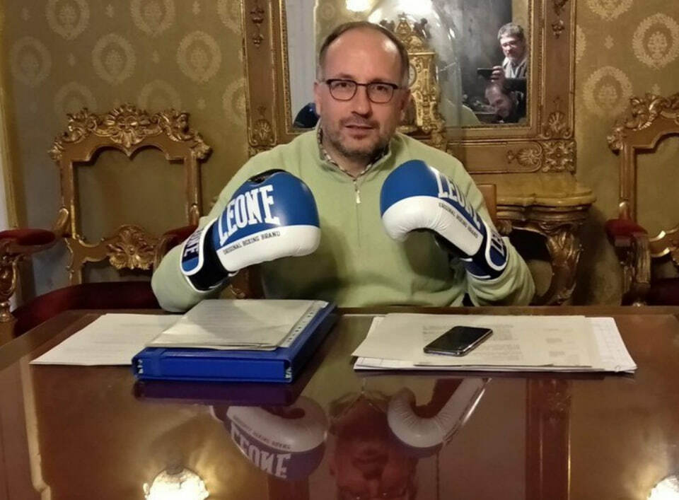 Stimolati da questa "guerra dei pixel", anche noi abbiamo voluto giocare con l'AI nella foto di copertina, immaginandoli come due pugili pronti al gong sotto l'insegna "ASTI". Un'immagine non casuale: l'uno, Bovino, è stato assessore allo Sport; l'altro, Rasero, aveva scherzosamente indossato i guantoni (immagine sottostante) durante la conferenza stampa di annuncio del patrocinio al primo Asti Pride, proprio per ironizzare sulle frizioni interne alla sua maggioranza contraria all'evento.