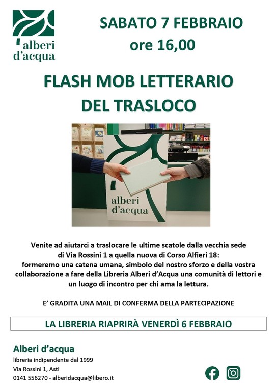 La Libreria Alberi d’Acqua cambia sede: da Via Rossini si trasferisce a pochi metri, in Corso Alfieri 18. La riapertura è prevista per venerdì 6 febbraio, mentre il giorno successivo, sabato 7, la libreria propone un gesto simbolico: un flash mob per trasportare le ultime scatole dalla vecchia alla nuova sede.