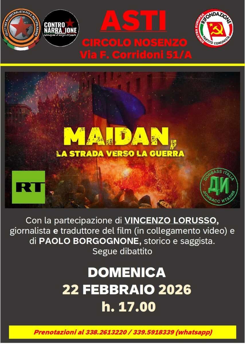 "In guerra la prima vittima è la verità", sosteneva Eschilo oltre 2500 anni fa. "Per cercare di ricostruirne almeno un frammento, spesso è utile, sebbene non sufficiente, ascoltare le diverse versioni di un conflitto". Con questo intento viene proposto il documentario "Maidan", prodotto dall’emittente Russia Today e tradotto in italiano a cura del giornalista Vincenzo Lorusso di Donbass Italia, residente a Lugansk. Il documentario verrà proiettato al circolo Nosenzo domenica 22 febbraio alle 18.