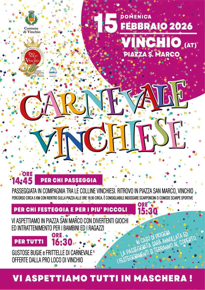 Passeggiare tra le colline, giocare in piazza e stare insieme. Domenica 22 febbraio Vinchio si veste a festa per un pomeriggio carnevalesco di convivialità e vita all’aperto. L’appuntamento è in piazza San Marco, dove a partire dalle 14.45 prenderà il via una passeggiata in compagnia tra i suggestivi paesaggi collinari vinchiesi, con un percorso di circa 5 km e rientro previsto intorno alle 16.30 nella stessa piazza. Per chi partecipa, è consigliato indossare scarponcini o calzature sportive comode.
