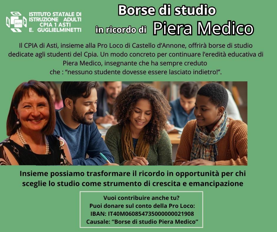 Piera Medico, profondamente legata al territorio astigiano e al suo Castello d'Annone, aveva fatto della scuola una missione civile e umana. "Amava ripetere che nessuno studente doveva essere lasciato indietro", ricordano dal CPIA. "Sapeva cogliere le fragilità, intuire le difficoltà, sostenere chi rischiava di arrendersi". Un patrimonio educativo che l'istituto ha scelto di custodire e rilanciare attraverso un'iniziativa concreta.
