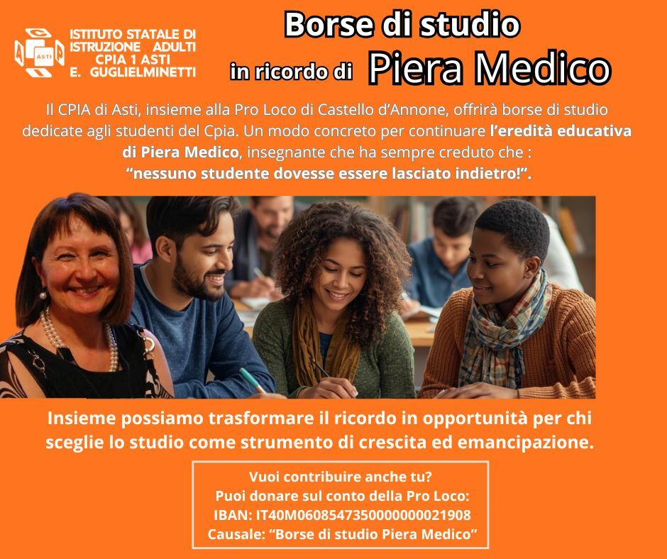 La decisione, assunta di concerto con la Pro Loco di Castello d'Annone, prevede il finanziamento dell'iniziativa attraverso contributi volontari. Chi desidera partecipare può effettuare un versamento sul conto corrente della Pro Loco. IBAN: IT40M0608547350000000021908 Banca: Banca di Asti. Causale: “Borse di studio Piera Medico”. . La Pro Loco provvederà a rendere pubbliche le somme raccolte e a curare l'erogazione dei sostegni economici.