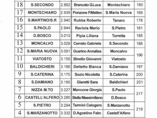 Completano la graduatoria S. Damiano (3.185), S. Caterina (3.170), Baldichieri (3.166), Viatosto (3.155), S. Maria Nuova (3.091), Moncalvo (3.029), Don Bosco (3.013), S. Paolo (2.944), S. Martino/S. Rocco (2.940), Montechiaro (2.939), S. Secondo (2.862), Tanaro (2.781) e Cattedrale (2.769).