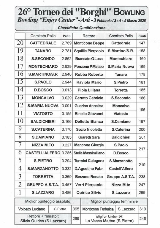 Al termine della fase di qualificazione è S. Lazzaro a chiudere al comando con 3.486 punti, confermandosi riferimento del torneo. Alle sue spalle il Gruppo dell’A.S.T.A. (3.457) e Torretta (3.369). A seguire S. Marzanotto (3.332), S. Pietro (3.294), Castell’Alfero (3.285) e Nizza Monferrato (3.227).