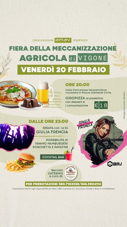 La novità del 2026 della Fiera della Meccanizzazione agricola è la serata di venerdì 20 che anticipa il classico inizio gli eventi musicali ed enogastronomici nella tensostruttura riscaldata di piazza Clemente Corte. Lì, alle 20, inizierà il giropizza al padellino con dessert (18 euro) e dalle 22 partirà la musica di dj Giulia Frencia con cocktail bar e servizio ristoro (hamburger, porchetta e patatine).