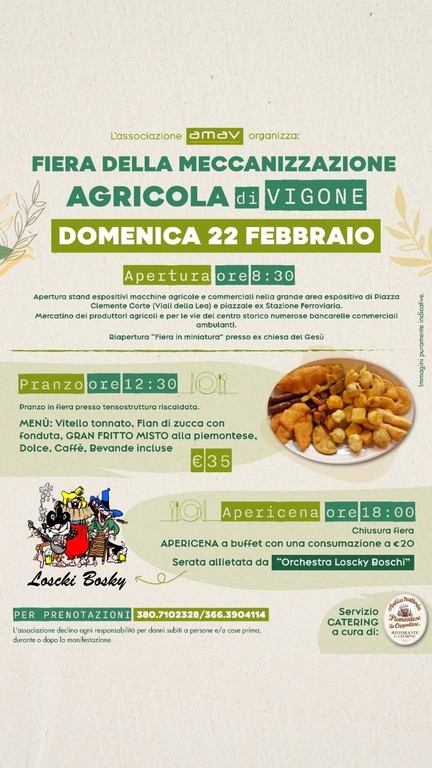 Domenica 22 ai macchinari in mostra si aggiungerà il mercatino dei produttori agricoli per le vie del centro storico, oltre alle bancarelle di commercianti e ambulanti. Per pranzo appuntamento con il gran fritto misto alla piemontese introdotto da vitello tonnato e flan di zucca con fonduta (35 euro, dolce, caffè e bevande incluse) mentre l’apericena a buffet (20 euro), e la storica orchestra di rock folk ironico demenziale ‘Loscki Bosky’, chiuderanno l’edizione 2026 della Fiera.