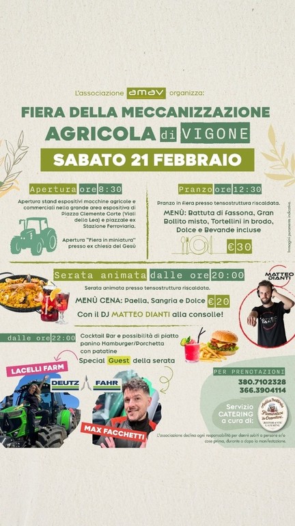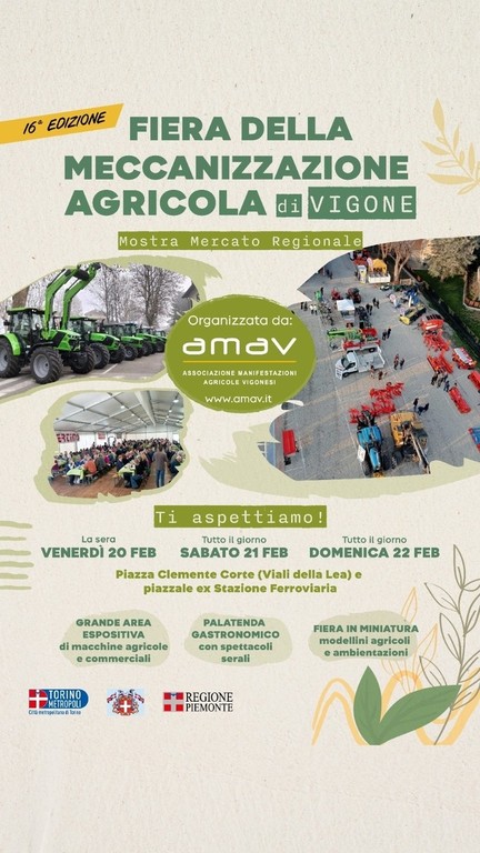 Vigone si prepara ad accogliere la Fiera della Meccanizzazione Agricola che, in Piemonte, apre la stagione degli eventi dedicati al settore. In programma da venerdì 20 a domenica 22 febbraio è infatti la prima manifestazione del suo genere secondo il calendario regionale. Ad organizzarla è l’Amav (Associazione manifestazioni agricole vigonesi), composta da agricoltori e amici che dal 2011 aprono la stagione degli eventi agricoli della pianura piemontese: “Da allora continuiamo a riproporla in questo periodo, per aprire la stagione, correndo il rischio di festeggiare anche in mezzo alla neve” racconta Marco Geuna per Amav.