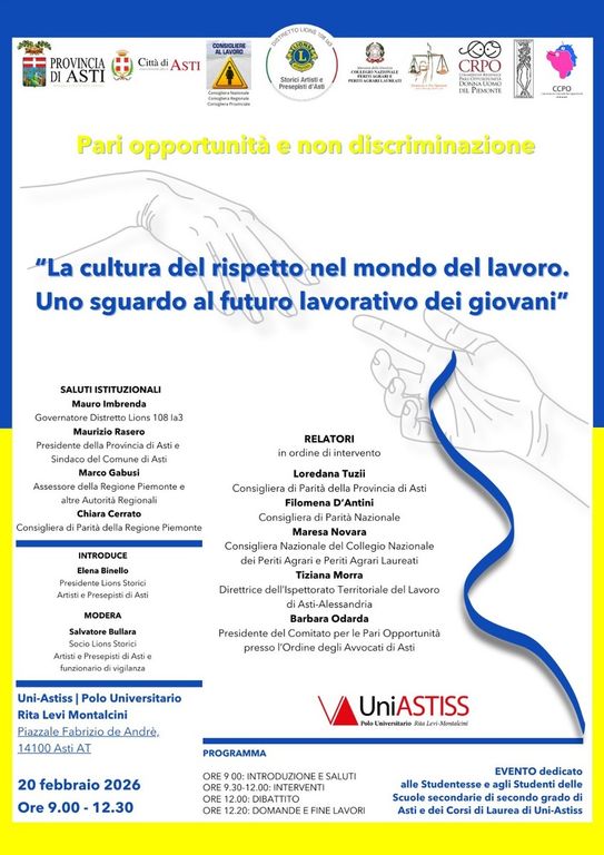 Si intitola "La cultura del rispetto nel mondo del lavoro. Uno sguardo al futuro lavorativo dei giovani" l'importante momento di approfondimento in programma per venerdì 20 febbraio presso il Polo universitario Rita Levi Montalcini, situato in piazza Fabrizio De Andrè, e si svolgerà nel corso della mattinata, dalle ore 9 alle 12.30.