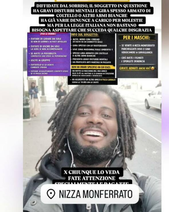 La prima parte dell’esposto è dedicata proprio ai post ignobili comparsi sui social, accompagnati dalla foto di Naudy e da commenti che lo indicavano come un pericolo per la comunità.