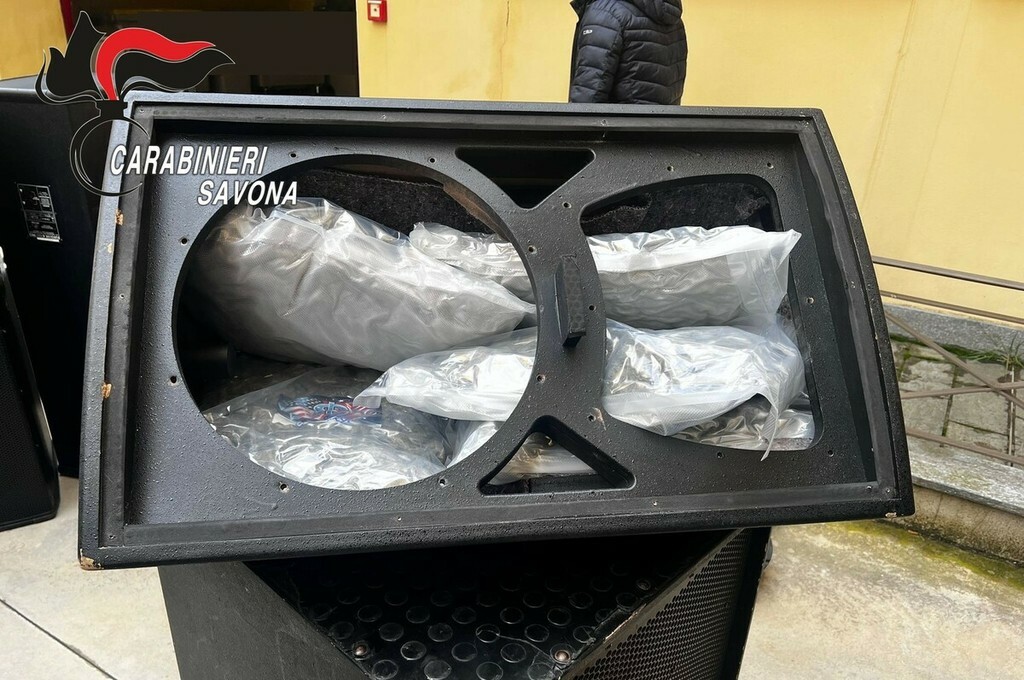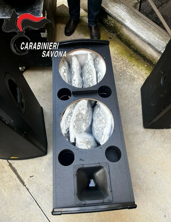 Ad un controllo più approfondito, gli altoparlanti e l’altro materiale sono risultati modificati artigianalmente per creare doppi fondi nei quali erano occultati complessivamente oltre 66 kg di marijuana, confezionata in involucri termosaldati.