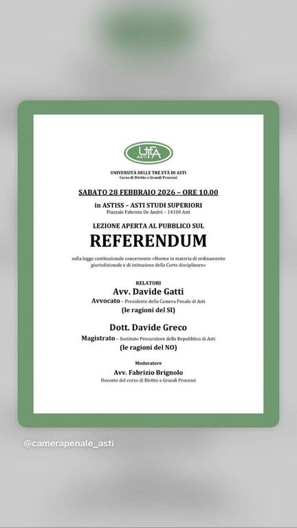 Sabato 28 febbraio, alle ore 10, l’Università delle Tre Età di Asti promuove una lezione aperta al pubblico dedicata al tema del referendum sulla legge costituzionale in materia di ordinamento giurisdizionale e istituzione della Corte disciplinare.