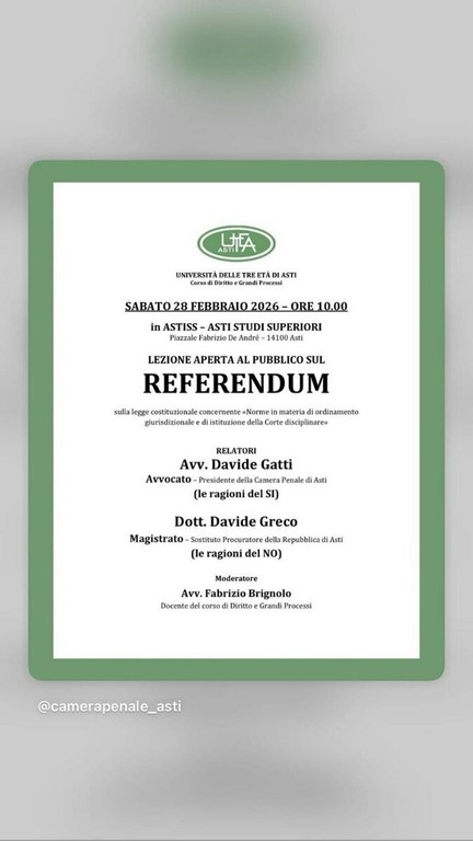 Sabato 28 febbraio, alle ore 10, l’Università delle Tre Età di Asti promuove una lezione aperta al pubblico dedicata al tema del referendum sulla legge costituzionale in materia di ordinamento giurisdizionale e istituzione della Corte disciplinare.