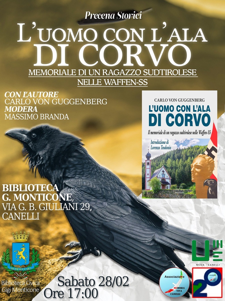 Proseguono a Canelli gli appuntamenti con i Precena Storici, organizzati da Memoria Viva in collaborazione con l'Unitre Nizza-Canelli e la Biblioteca "Gigi Monticone". Dopo l'incontro dedicato alla DOCG Alta Langa con Gianni Malerba, sabato 28 febbraio alle 17 sarà la volta dello storico Carlo von Guggemberg, che presenterà "L'uomo con l'ala di corvo. Il memoriale di un ragazzo sudtirolese nelle Waffen-SS".