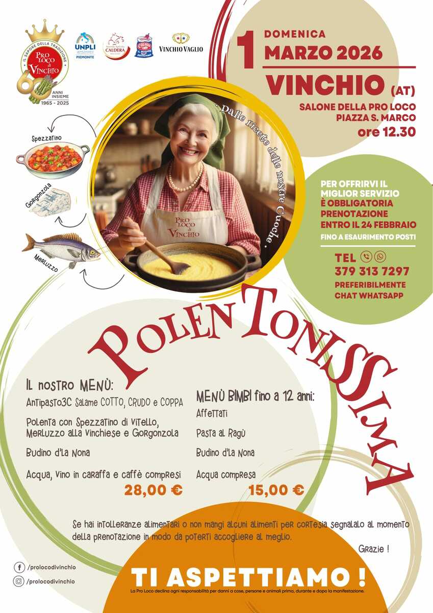 Un pranzo tutto da gustare, all'insegna dei sapori autentici e della convivialità. Domenica 1° marzo 2026, il Salone della Pro Loco di Vinchio, in piazza San Marco, ospiterà un pranzo conviviale aperto a tutta la comunità, con un menù ricco di piatti della tradizione locale.