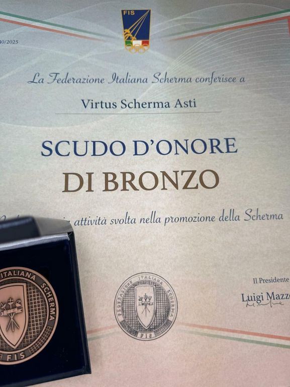 Grande soddisfazione anche per la Virtus Scherma Asti, alla quale è stato conferito lo Scudo d’Onore di Bronzo per i suoi oltre 15 anni di attività. Il prestigioso riconoscimento è stato ritirato dal vicepresidente Marco Valpreda, in rappresentanza del sodalizio astigiano.