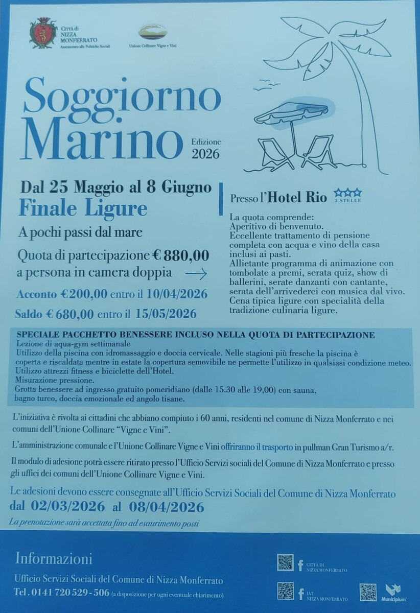 Accanto alle politiche turistiche, torna il soggiorno marino dell’Unione collinare, iniziativa sostenuta dal Comune di Nizza Monferrato, che porterà i cittadini a Finale Ligure (in locandina i dettagli e i contatti per le prenotazioni).