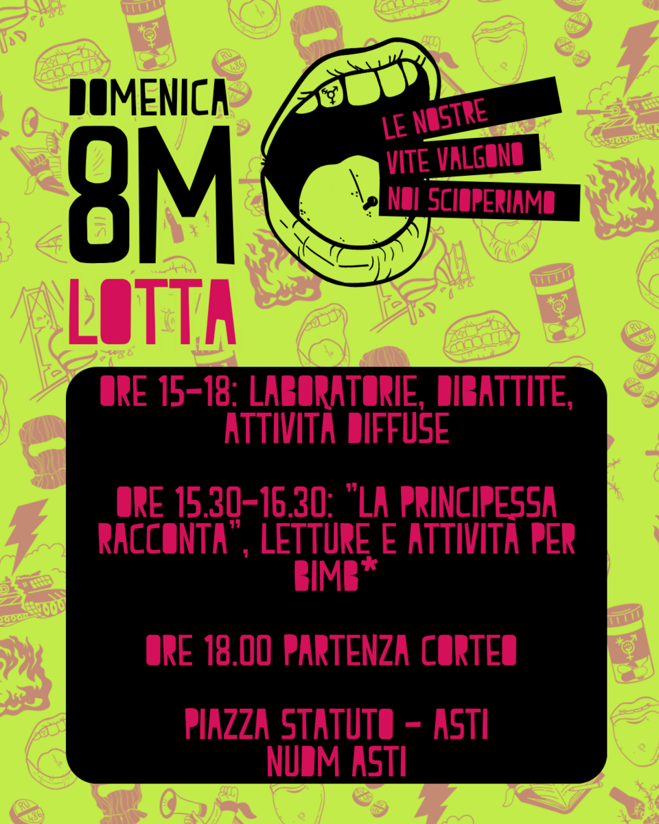 Domenica 8 marzo le attività si sposteranno in piazza Statuto ad Asti. Dalle 15 alle 18 sono previsti laboratori gratuiti, dibattiti ed esposizioni artistiche, con uno spazio dedicato anche ai più piccoli. Alle 15.30 l'associazione La Principessa Racconta curerà letture e laboratori per bambini dai tre anni in su. La giornata culminerà nel corteo cittadino che partirà alle 18 da piazza Statuto per attraversare i luoghi simbolo del centro.