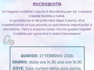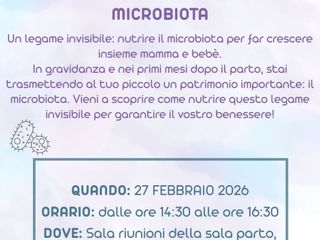 Oggi, dalle 14.30 alle 16.30 nella sala riunioni della Sala Parto del Cardinal Massaia, si terrà un evento dedicato al tema del microbiota, cioè l’insieme dei microrganismi che vivono in modo stabile nel corpo umano e che, durante la gravidanza, svolgono un ruolo fondamentale per la salute della mamma e del bambino.