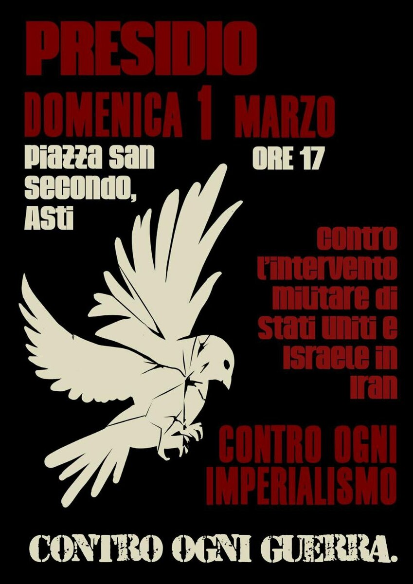 La drammatica escalation in Medio Oriente riecheggia anche nelle piazze astigiane. Oggi, domenica 1 marzo, si terrà un presidio in piazza San Secondo a partire dalle 17. La manifestazione è organizzata dalla Rete Asti per la Palestina in sinergia con i movimenti studenteschi locali. La locandina, raffigurante una colomba della pace e diffusa capillarmente sui social, non lascia spazio a interpretazioni: l'obiettivo è opporsi fermamente al recente e massiccio intervento militare condotto dagli Stati Uniti e da Israele in Iran. L'invito alla mobilitazione si chiude con messaggi netti: "Contro ogni imperialismo" e "Contro ogni guerra".
