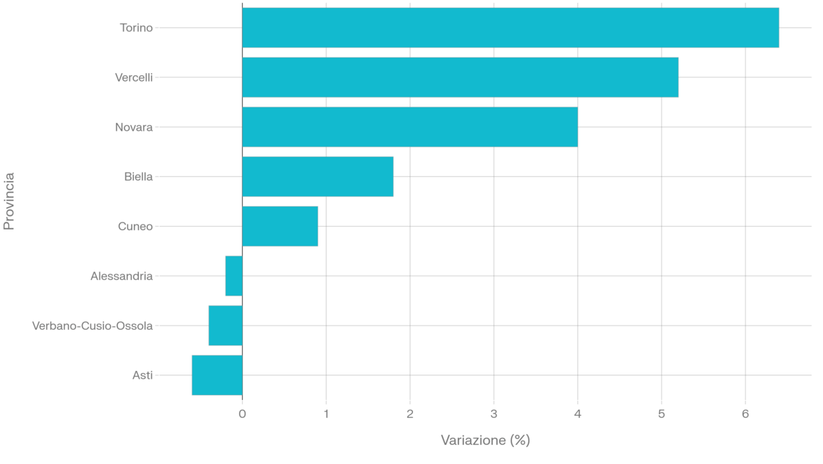Se il quadro generale infonde ottimismo, declinando i dati a livello territoriale emerge una mappa a più velocità, in cui la provincia di Asti si colloca purtroppo in fondo alla classifica. Mentre Torino spicca con un vigoroso +6,4% nel quarto trimestre, seguita da Vercelli (+5,2%) e Novara (+4,0%), il territorio astigiano chiude il periodo in negativo, registrando una flessione dello 0,6%.
