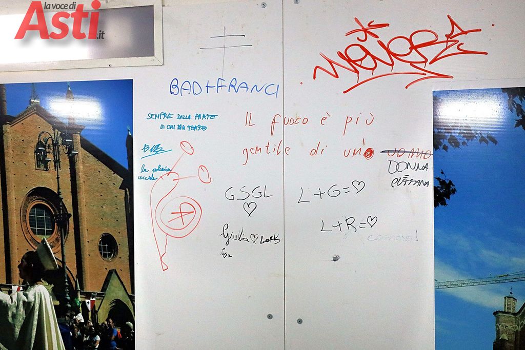 Tuttavia, proprio in questi giorni in cui anche Asti si prepara a celebrare la Giornata internazionale dei diritti della donna con mostre e dibattiti (come l'esposizione "Com'eri vestita?" appena inaugurata al Cardinal Massaia), a fare maggiormente ribrezzo è una scritta in particolare. Su uno dei pannelli, la parola "uomo" (scritta tra l'altro con un inaccettabile e grossolano apostrofo: un'uomo) è stata brutalmente cancellata con un tratto rosso per fare spazio alla dicitura "donna puttana", vergata a caratteri cubitali neri proprio sotto lo strafalcione grammaticale.