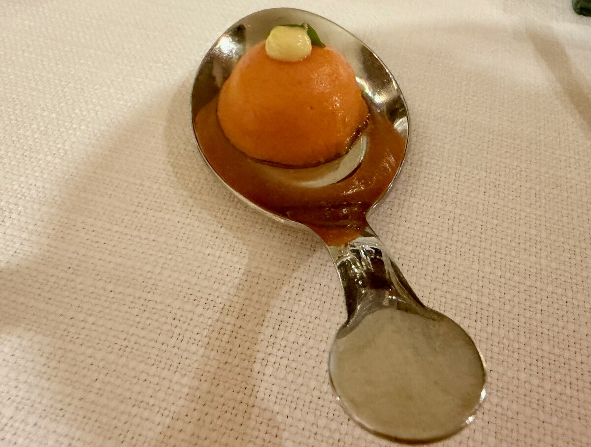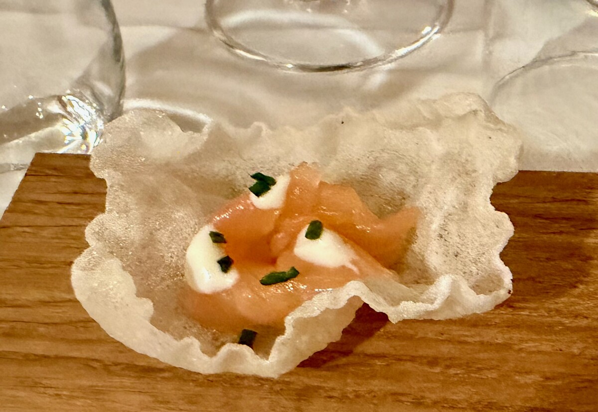 I primi tre piatti, proposti come appetizer, nell’aprire il percorso con leggerezza, suggeriscono una precisa idea di cucina, forse penalizzata solo da una croccantezza leggermente sottotono: la Cialda di riso al salmone affumicato è piacevole nei sapori e ben centrata negli equilibri aromatici;