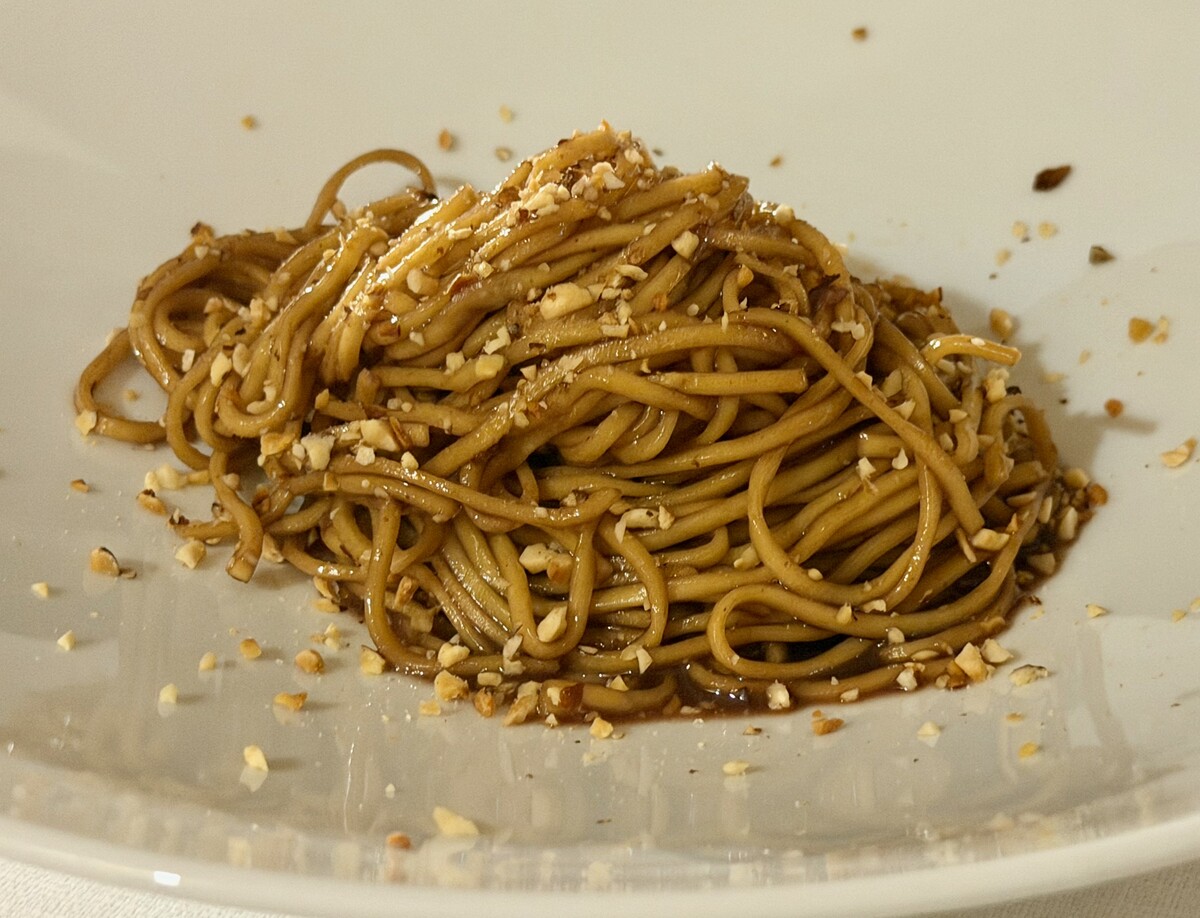 Tanto inconsueti quanto intriganti i Tajarin al Porto, burro fuso e grana di nocciole: un piatto decisamente riuscito nel suo calibrare la consistenza del tajarin con il sapore dolce, ma per nulla stucchevole, degli ingredienti utilizzati per condirli.