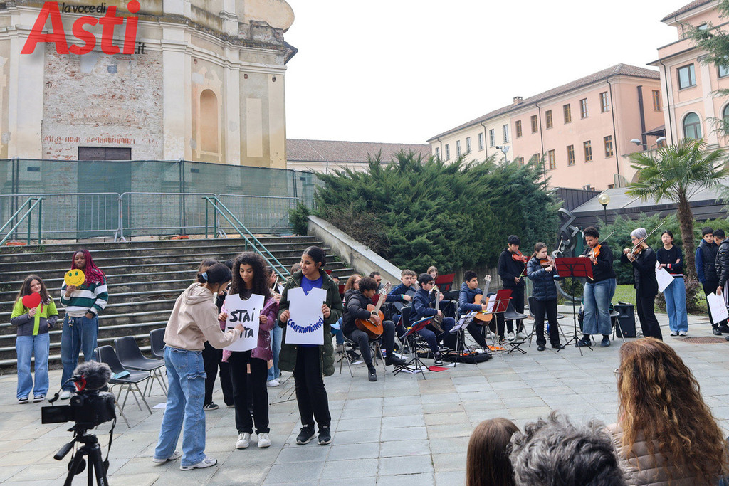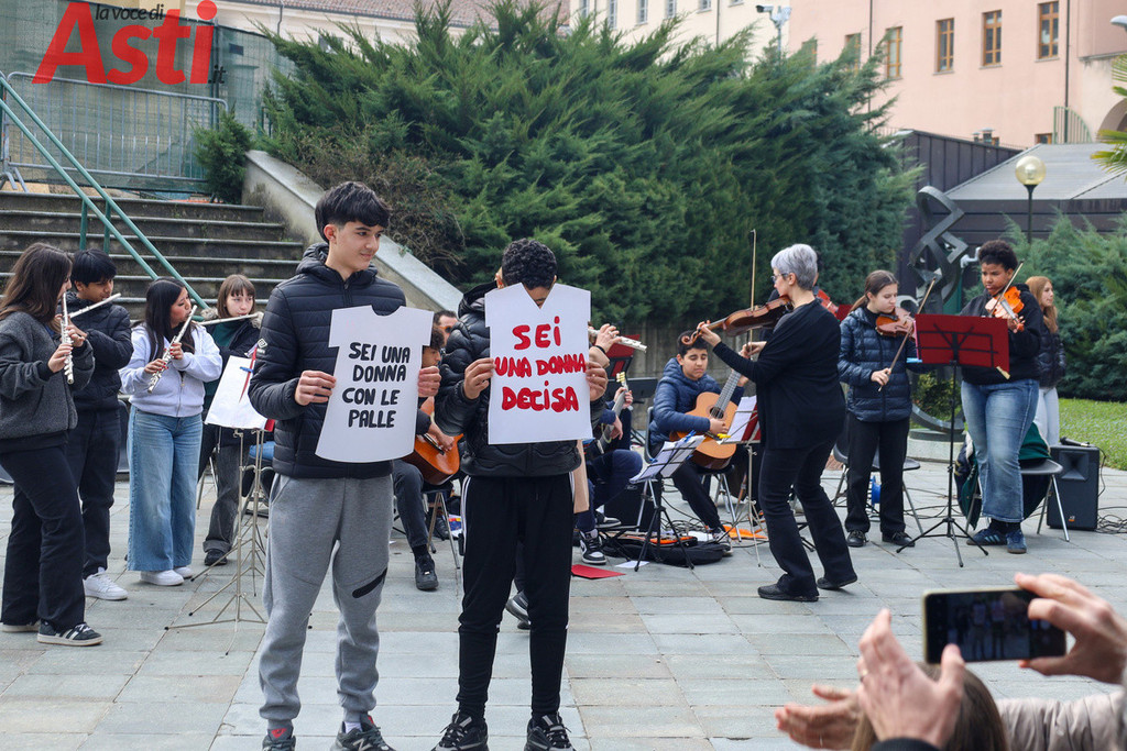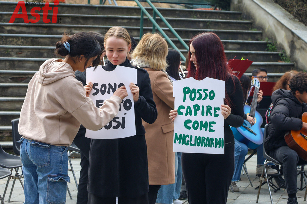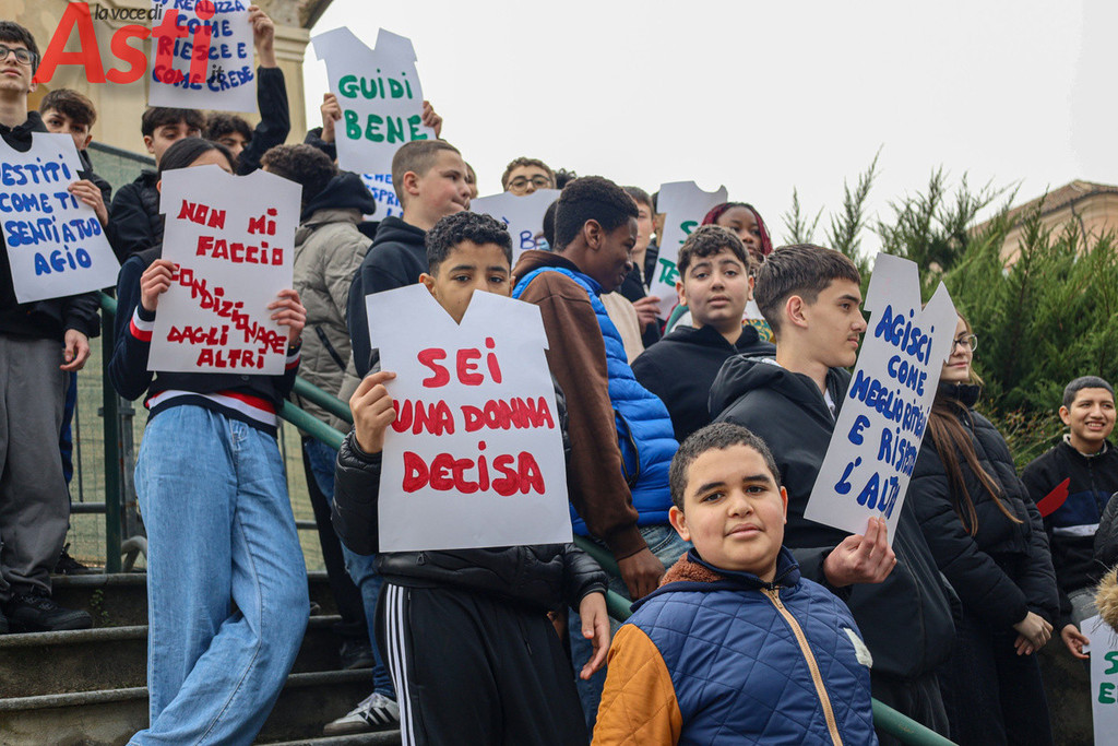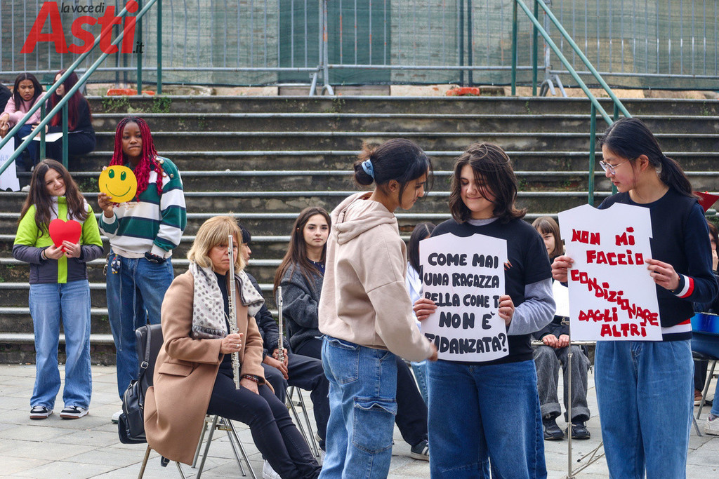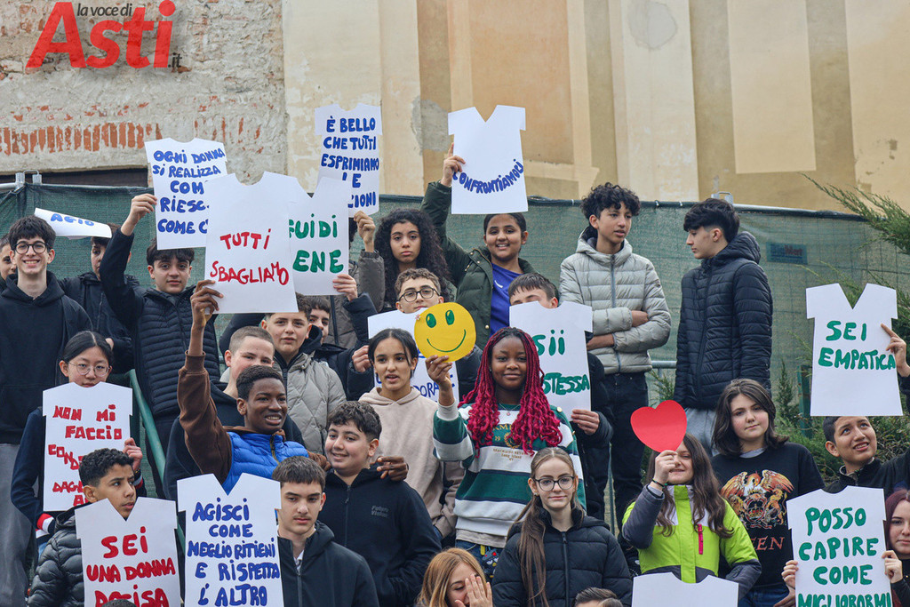 "Sei una donna decisa", recita un cartello tracciato con vernice rossa e tenuto stretto da un ragazzo in prima fila. "Non mi faccio condizionare dagli altri", rivendica quello accanto a lui, mentre dal gruppo spuntano altri messaggi inequivocabili. "Vestiti come ti senti a tuo agio", "Guidi bene", "Agisci come meglio ritieni e rispetta l'altra". Frasi all'apparenza semplici ma che, lette tutte insieme sulle gradinate, compongono un alfabeto nuovo per la nostra comunità. Nello spettacolo di parole e musica, nato dalla sinergia con le istituzioni forensi astigiane e la Rete di Scuole per la promozione dei valori della Giustizia, gli studenti non si sono limitati a denunciare il sessismo, ma hanno messo in piazza la sua antitesi.