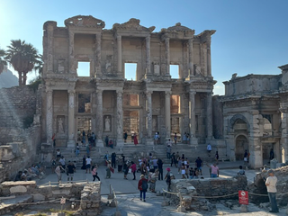 Scendendo verso la costa dell’Egeo, l’aria si fa più umida. Gli ulivi occupano le colline con eleganza geometrica. Tra pendii chiari e sentieri polverosi appare Efeso. Non è solo un sito archeologico: è la testimonianza di un sistema urbano complesso. La via principale scende, verso il basso, tra pavimentazione perfetta e capitelli caduti. Commercio, culto, politica: tutto organizzato con precisione romana. La Biblioteca di Celso domina la prospettiva. La facciata, con colonne sovrapposte e nicchie allegoriche, è un manifesto di comunicazione visiva. È un edificio pensato per essere guardato frontalmente, per produrre consenso attraverso la proporzione. I visitatori si dispongono davanti come un pubblico in attesa dello spettacolo. Poco oltre, il Grande Teatro apre la sua curva verso la pianura: migliaia di posti scolpiti nella collina, un’architettura che organizza voce e sguardo. Efeso non suggerisce malinconia. È un manuale a cielo aperto su come si viveva. Ma è anche la dimostrazione di come le “cose" cambino.