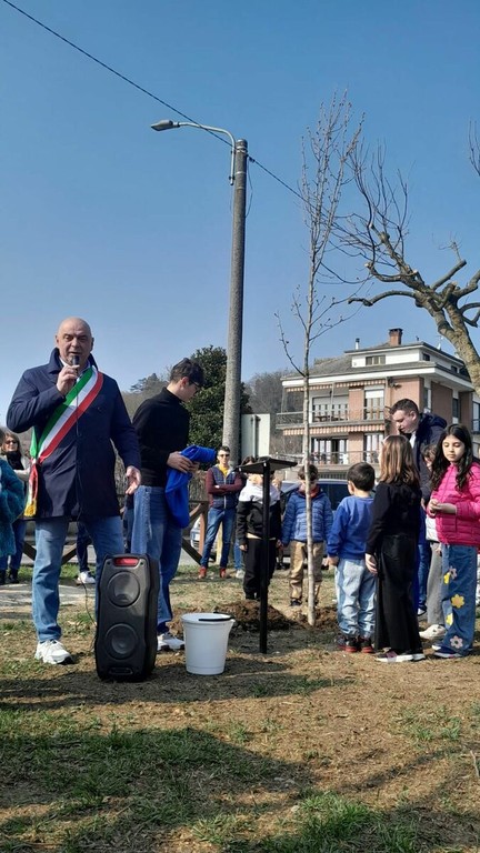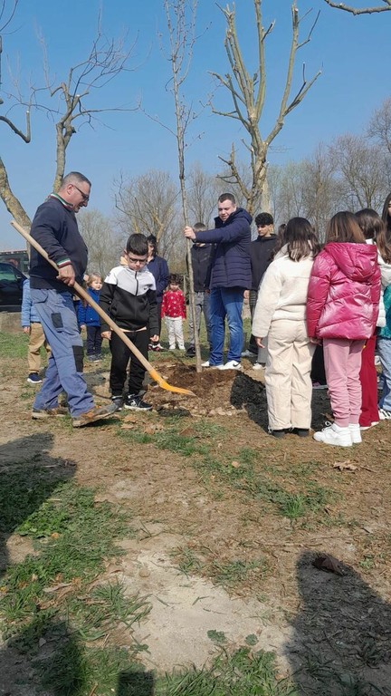 Dopo gli interventi istituzionali si è svolto il momento più simbolico della giornata: la piantumazione del pero fiorito. Attorno all’albero si sono riuniti bambini, insegnanti, studenti e cittadini, trasformando un gesto semplice in un segno concreto di partecipazione e crescita condivisa.