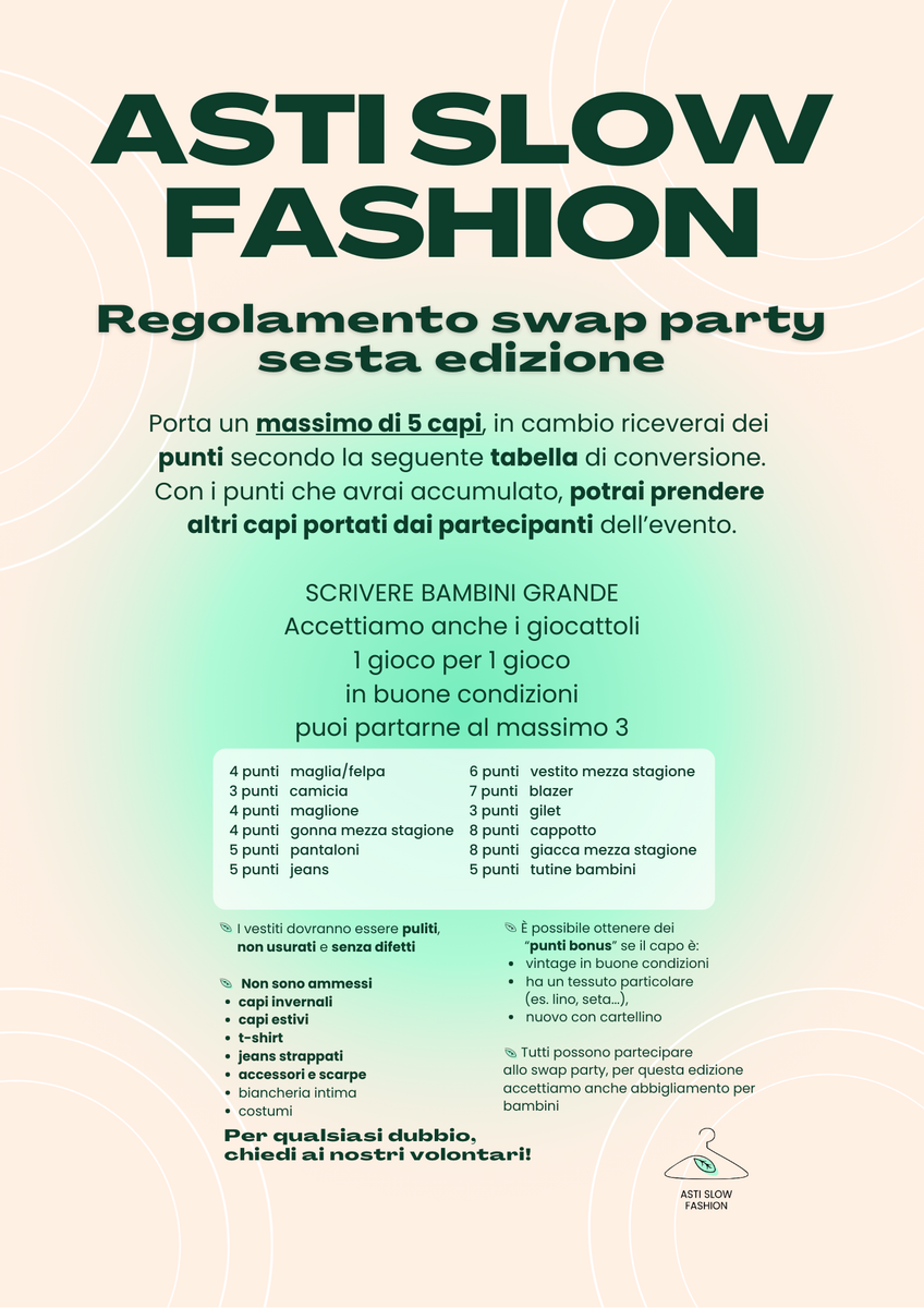 L’evento si terrà dalle 14 alle 19 e l’ingresso sarà a offerta libera a sostegno dei progetti di Asti Slow Fashion e delle attività di Jungla Urbana. I partecipanti potranno portare capi di abbigliamento da scambiare fino alle ore 18.
