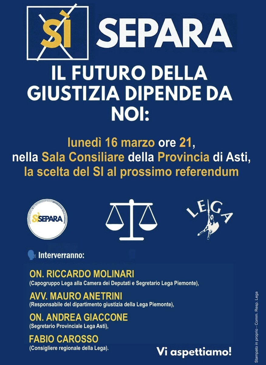 Il momento centrale del confronto politico è fissato per lunedì 16 marzo alle 21, presso la sala consigliare della Provincia di Asti. L’incontro, organizzato in collaborazione con il "Comitato Sì separa", vedrà intervenire, oltre a Riccardo Molinari, l’avvocato Mauro Anetrini, promotore del comitato e responsabile giustizia della Lega in Piemonte, il deputato Andrea Giaccone e il consigliere regionale Fabio Carosso.