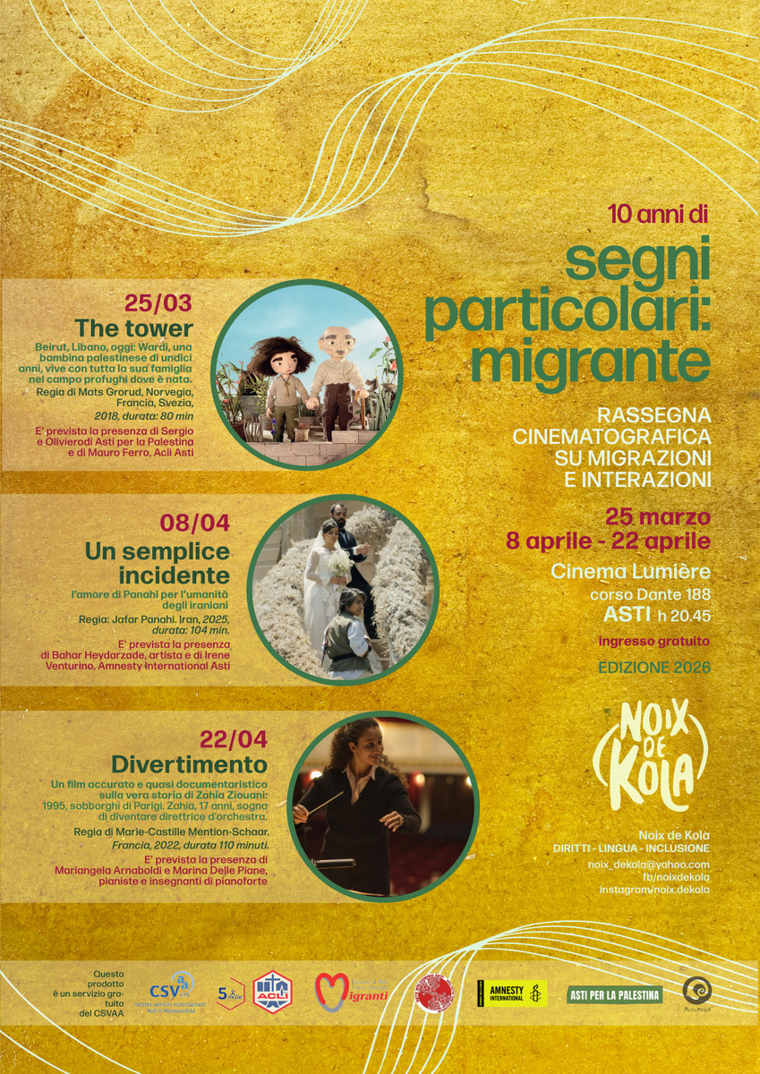 Raggiunge quest'anno il traguardo della decima edizione la rassegna cinematografica "Segni particolari: migrante", un'iniziativa culturale di grande respiro proposta dall'associazione astigiana Noix de Kola. Un risultato particolarmente significativo per la piccola realtà di volontariato, che continua a lottare quotidianamente contro la diminuzione dei contributi per offrire alla città un prezioso spazio di riflessione. Il cartellone prevede tre proiezioni, in programma mercoledì 25 marzo, mercoledì 8 e mercoledì 22 aprile, sempre alle 20,45 al cinema Lumière in corso Dante.