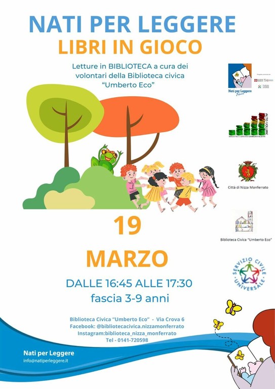 Dalle 16.45 alle 17.30, invece, la biblioteca civica “Umberto Eco” accoglierà l’incontro mensile di "Nati per Leggere - Libri in Gioco" per bambini da 3 a 9 anni. Un appuntamento per rafforzare e diffondere l'amore per i libri fin dalla prima infanzia.