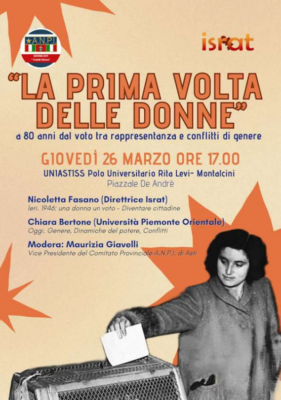 In occasione dell'ottantesimo anniversario dell'estensione del suffragio universale in Italia , la sezione Associazione Nazionale Partigiani d'Italia di Asti "Fratelli Olivero" e l'istituto Israt promuovono un momento di approfondimento pubblico per ripercorrere le tappe della partecipazione politica femminile. L'incontro, intitolato "La prima volta delle donne a 80 anni dal voto tra rappresentanza e conflitti di genere", si svolgerà giovedì 26 marzo alle ore 17 presso l'UniAstiss, all'interno del Polo Universitario Rita Levi-Montalcini.