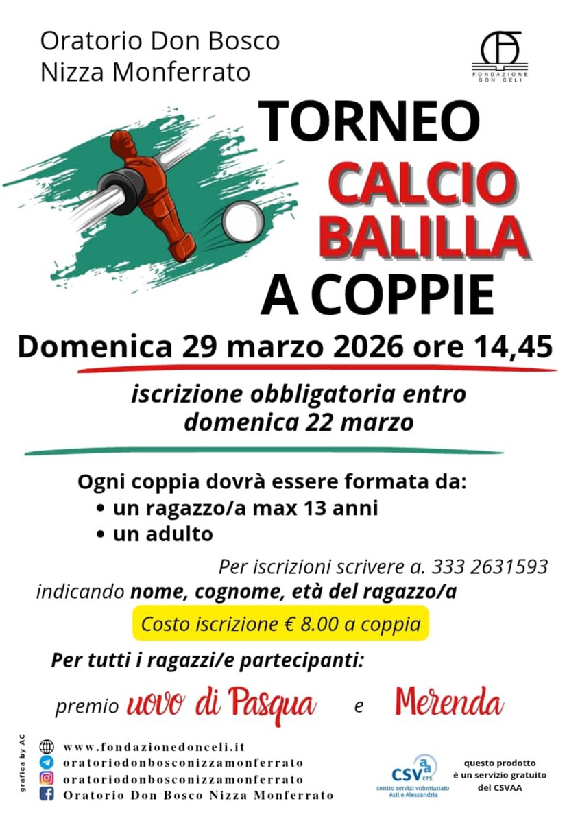Gioco e socialità all’Oratorio Don Bosco di Nizza Monferrato, dove, domenica 29 marzo, alle 14.45, gli spazi ospiteranno un torneo di calcio balilla a coppie.