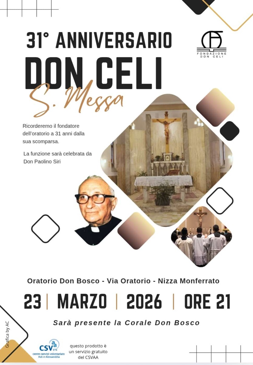 A Nizza Monferrato si prepara un momento di raccoglimento e memoria collettiva. Lunedì 23 marzo, alle 21, l’Oratorio Don Bosco ospiterà la messa in occasione del 31° anniversario della scomparsa di Don Celi.
