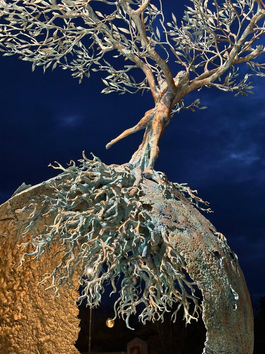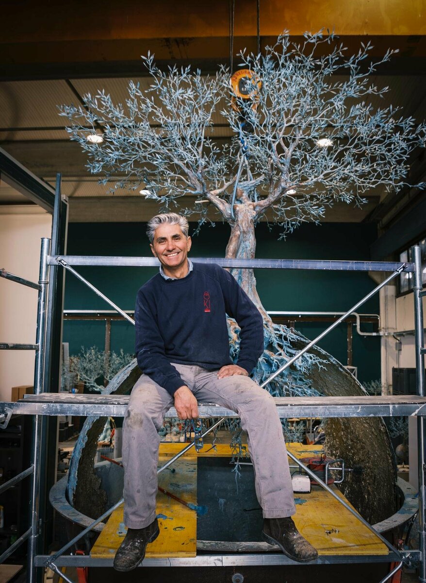 Le sue opere, alberi che affondano nella memoria e sfere che si aprono al cosmo, dialogano con le piazze, i moli trasformando ogni tappa in un incontro tra materia e infinito.