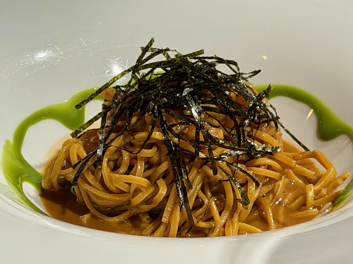 Ottimi e ben amalgamati, a conferma di una cucina capace di andare oltre il consueto, i Tajarin al Guviol ai 40 tuorli serviti con bisque, crostacei, lime e alga nori.
