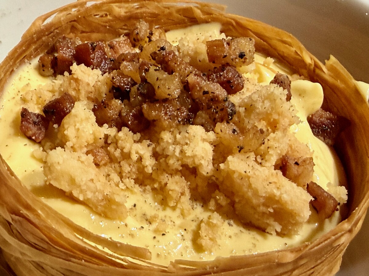 Capace di stupire infine, specie per chi come me non impazzisce per i dolci, Al Guviol con la panna diventa dolce; un curioso spaghetto di pasta fillo, crumble di guanciale e crema inglese alla carbonara. Degno finale di una cena capace di farsi ricordare.