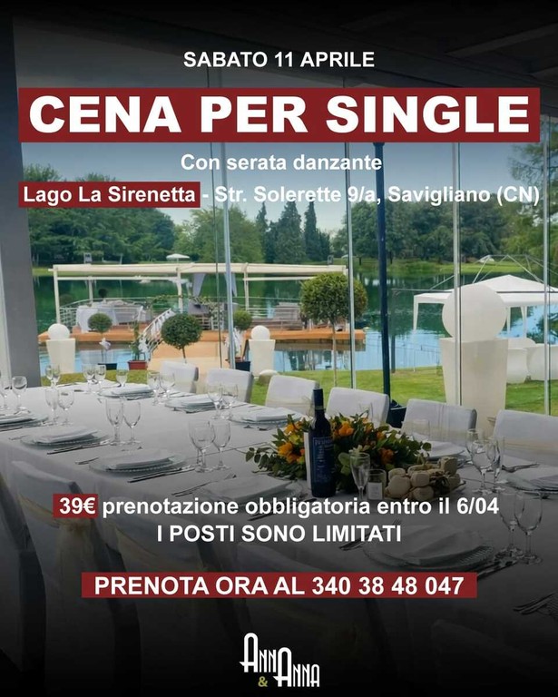 La primavera porta con sé il desiderio di novità, di uscite all'aria aperta e, perché no, di nuovi incontri che possano far battere il cuore. Anna & Anna, l’Agenzia per Single, leader nell'organizzazione di eventi che uniscono spontaneità e classe, invita tutti i cuori solitari a un nuovo appuntamento d'eccezione: la Cena per Single con serata danzante, prevista per sabato 11 aprile.