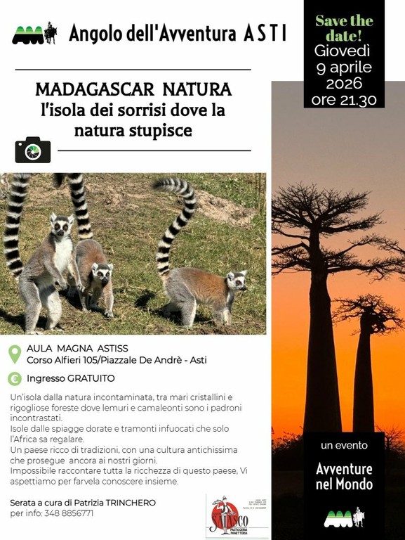 Domani, giovedì 9 aprile, l’Aula Magna Astiss di corso Alfieri ospiterà un nuovo incontro della rassegna dedicata ai racconti di viaggio. L’appuntamento è alle 21.30 con Patrizia Trinchero, che presenterà “Madagascar Natura”.