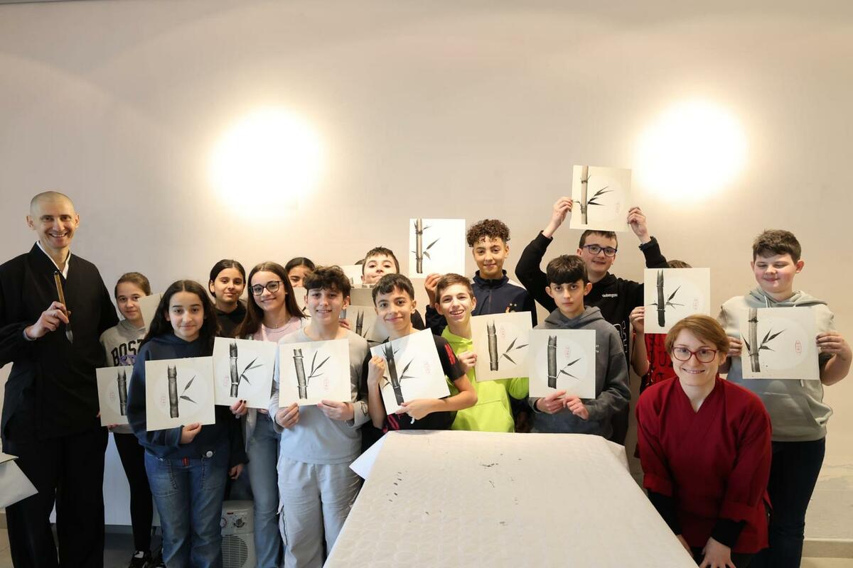 Il programma si è sviluppato lungo due direttrici principali. La prima ha riguardato i laboratori di Sumi-e ospitati nei locali della Biblioteca comunale. Qui gli studenti si sono cimentati nella pittura a inchiostro nero su carta di riso, una disciplina che richiede concentrazione e controllo della postura. Intesa come una vera e propria forma di arteterapia, la pratica del Sumi-e ha permesso ai partecipanti di lavorare sul proprio equilibrio interiore, migliorando sensibilmente il clima e la gestione del gruppo classe.