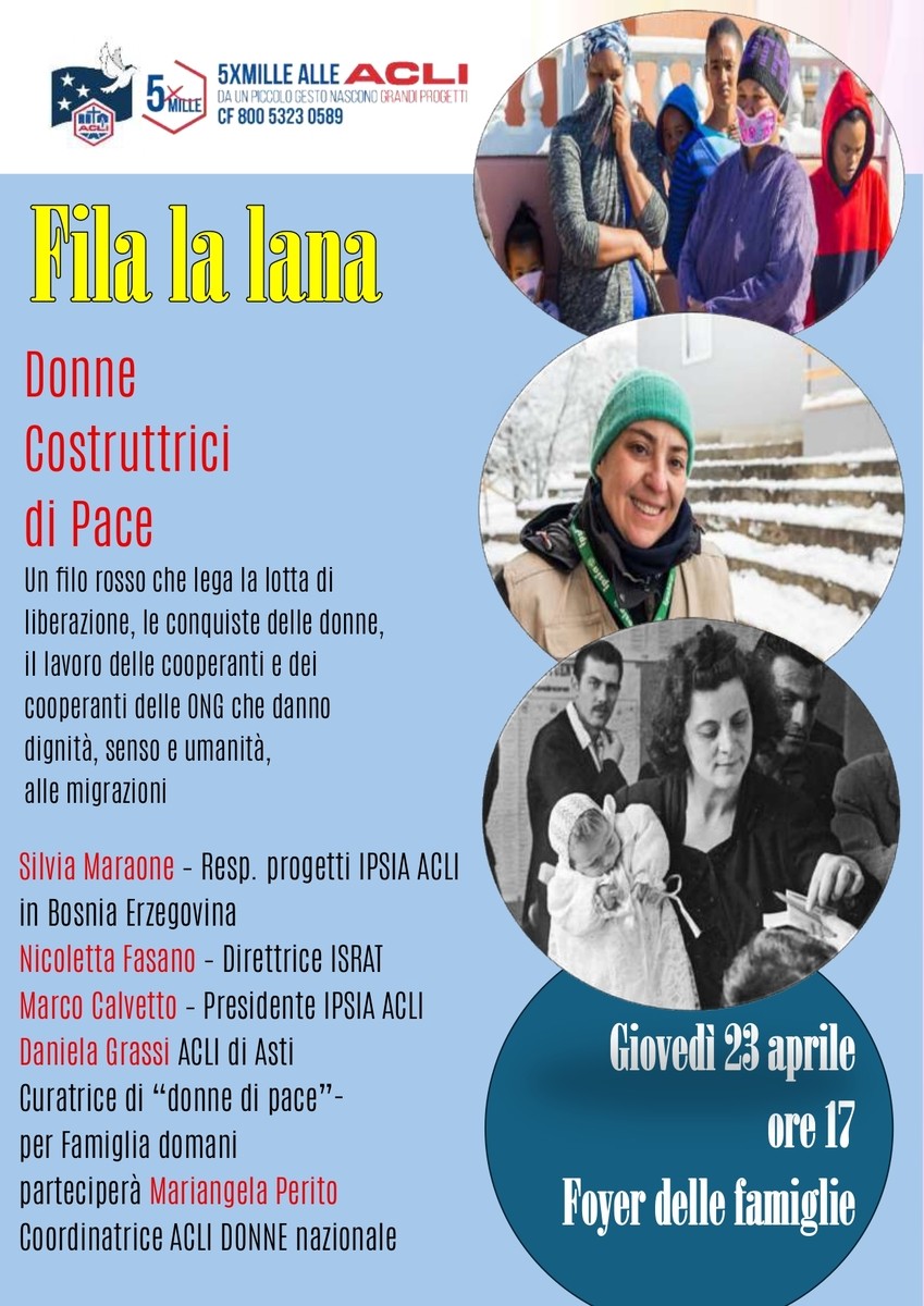 Giovedì 23 aprile alle 17, il Foyer delle Famiglie di Asti ospiterà l’incontro “Fila la lana - Donne costruttrici di pace”, promosso dalle ACLI di Asti, in collaborazione con le ACLI regionali del Piemonte e il Coordinamento donne ACLI Piemonte, all’interno delle celebrazioni del 25 Aprile, Festa della Liberazione, e dell’ottantesimo anniversario del riconoscimento del diritto di voto alle donne italiane.