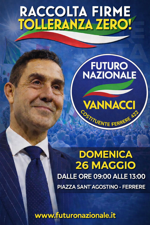 Comitato “Ferrere 422” di Futuro Nazionale ha annunciato per domenica 26 aprile l’allestimento di un gazebo informativo con raccolta firme in piazza Sant’Agostino a Ferrere. L’iniziativa rappresenta la risposta locale alla mobilitazione politica lanciata a livello nazionale dal presidente del partito Roberto Vannacci e dal coordinatore nazionale Massimiliano Simoni.