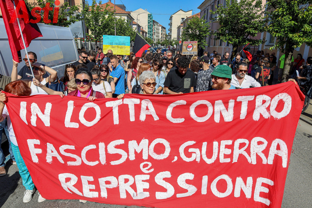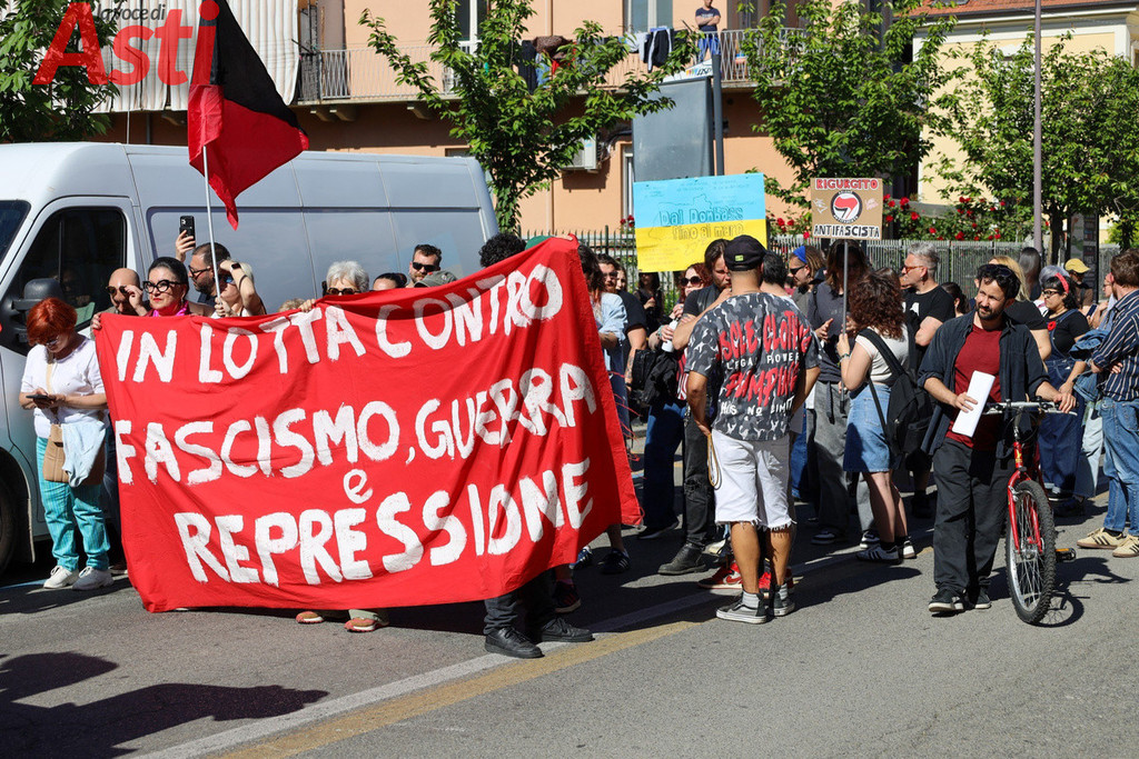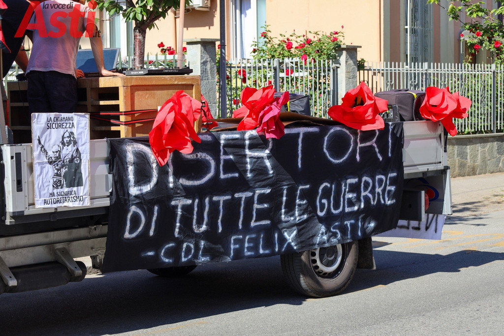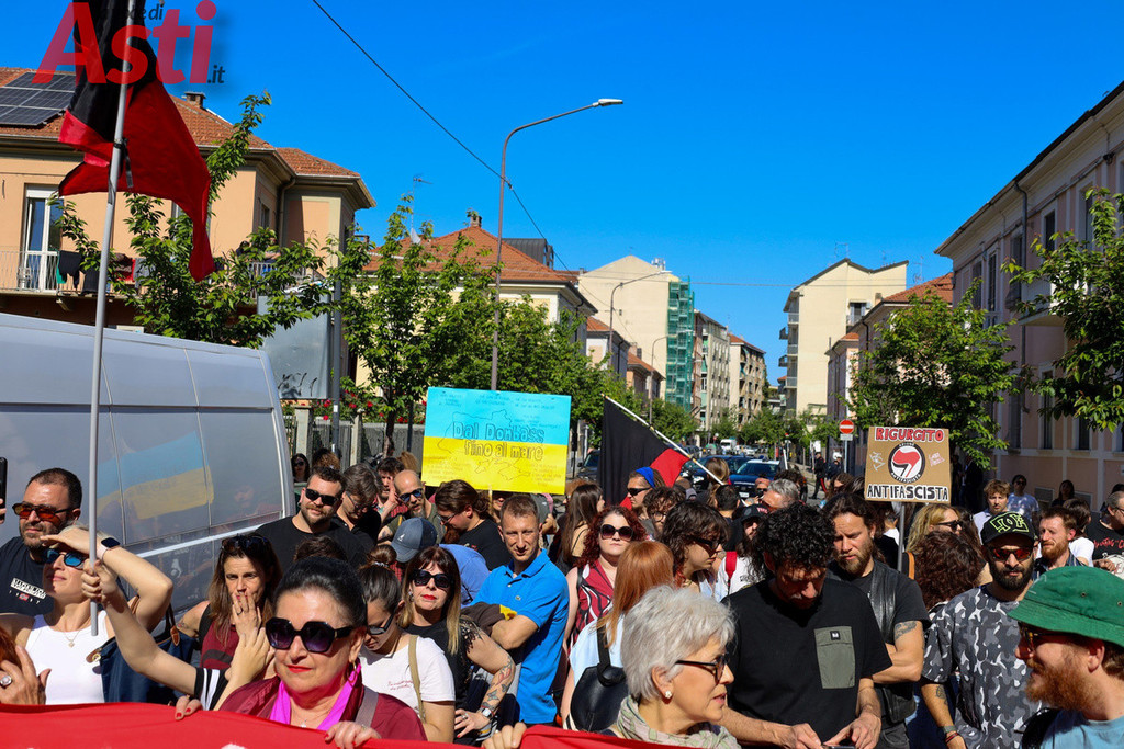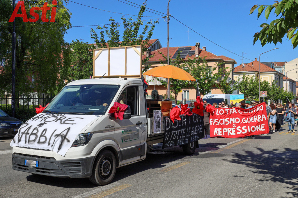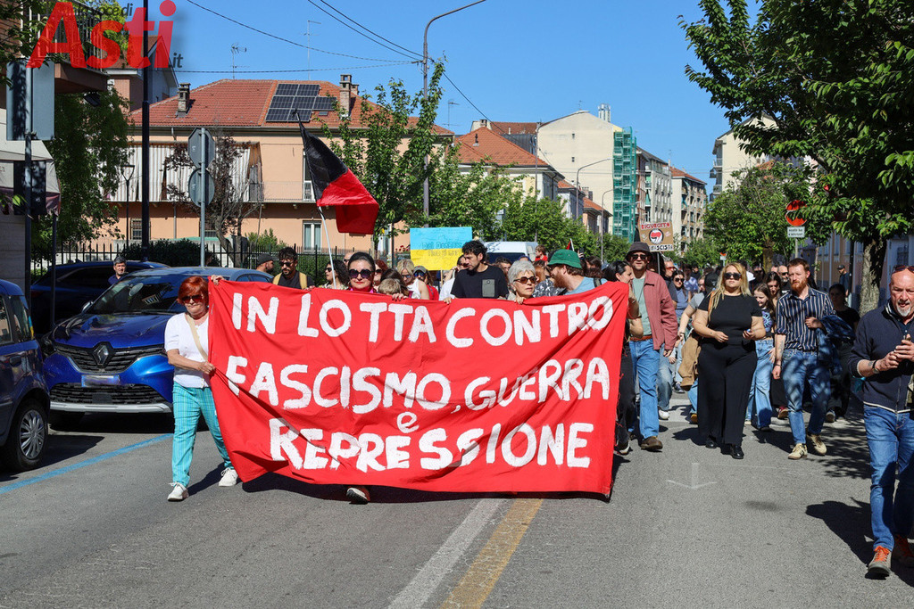Sul carro che apriva il corteo campeggiava anche il messaggio del Collettivo Felix Asti: "Disertori di tutte le guerre", decorato con papaveri rossi e affiancato da un cartello che recitava "La chiamano sicurezza, ma significa autoritarismo". Tra le bandiere rosse e anarchiche e i cartelli colorati, non mancavano riferimenti ai conflitti internazionali ancora aperti: uno striscione in giallo e azzurro recitava "Dal Donbass fino al mare", mentre un altro si identificava come "Rigurgito antifascista", a testimoniare quanto la giornata fosse vissuta non come semplice commemorazione storica ma come impegno politico concreto nel presente.