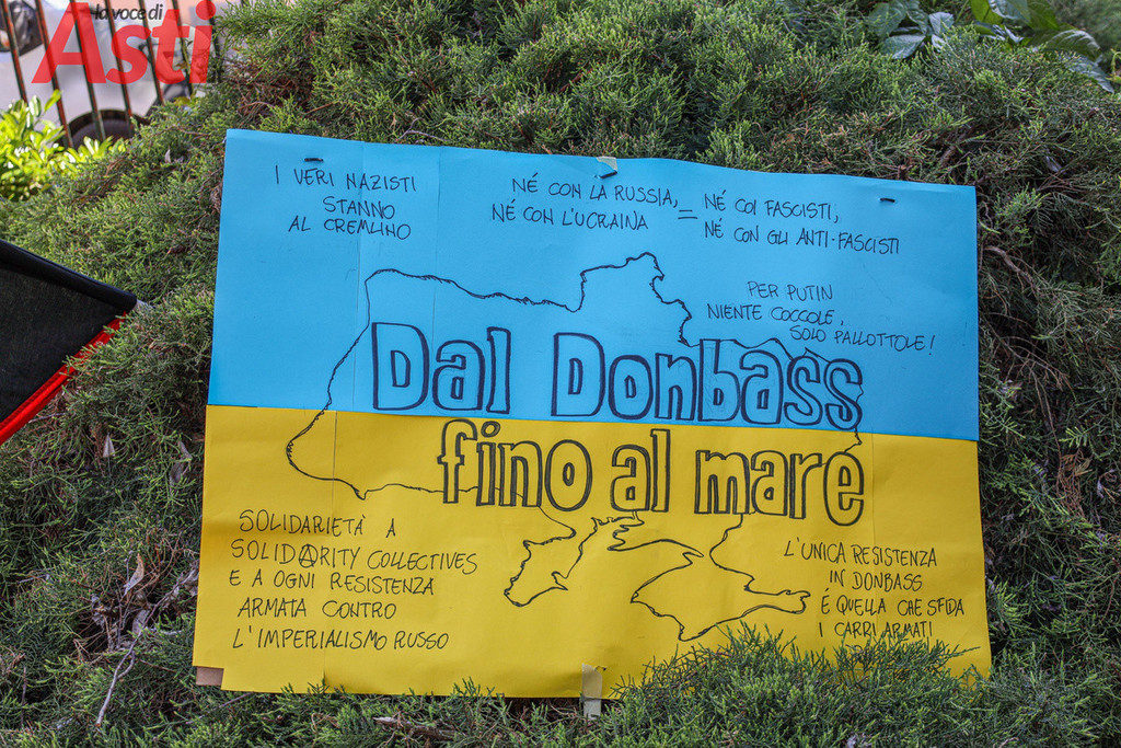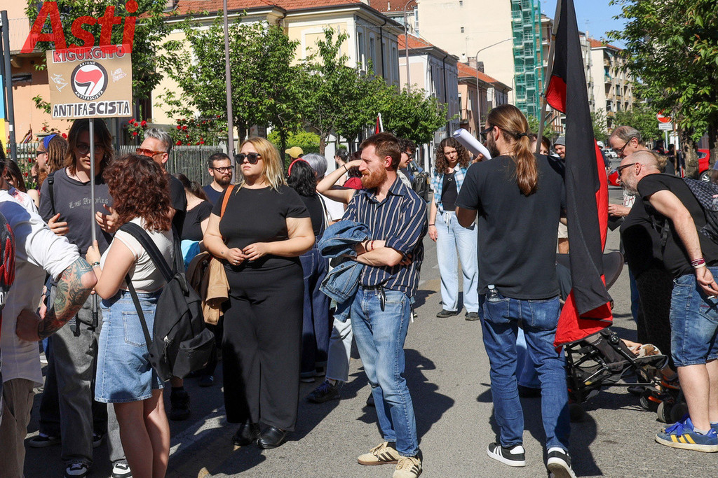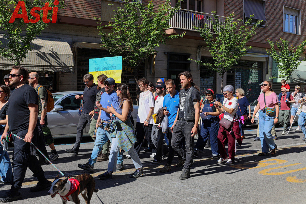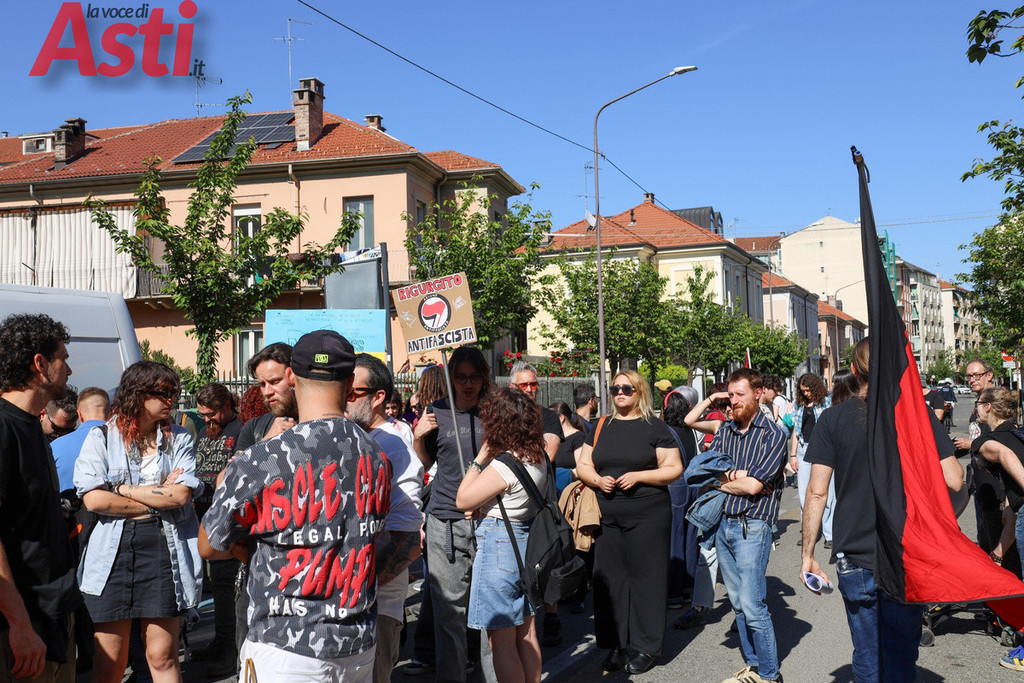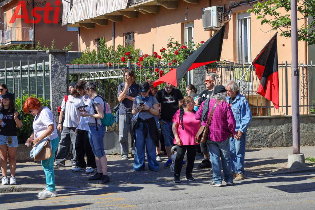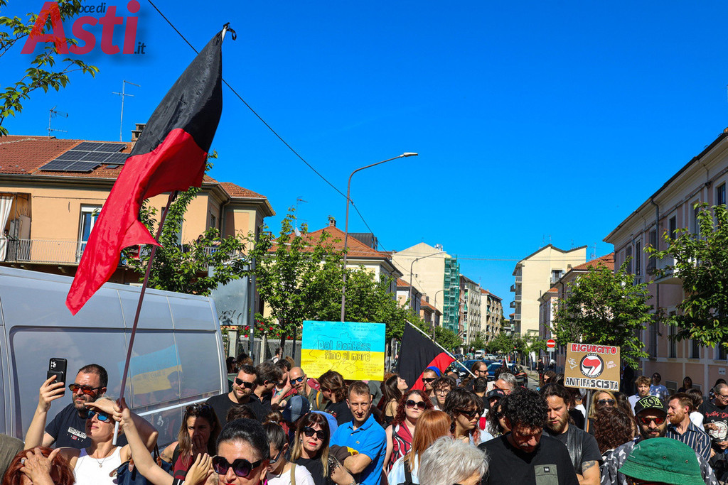 Sul carro che apriva il corteo campeggiava anche il messaggio del Collettivo Felix Asti: "Disertori di tutte le guerre", decorato con papaveri rossi e affiancato da un cartello che recitava "La chiamano sicurezza, ma significa autoritarismo". Tra le bandiere rosse e anarchiche e i cartelli colorati, non mancavano riferimenti ai conflitti internazionali ancora aperti: uno striscione in giallo e azzurro recitava "Dal Donbass fino al mare", mentre un altro si identificava come "Rigurgito antifascista", a testimoniare quanto la giornata fosse vissuta non come semplice commemorazione storica ma come impegno politico concreto nel presente.