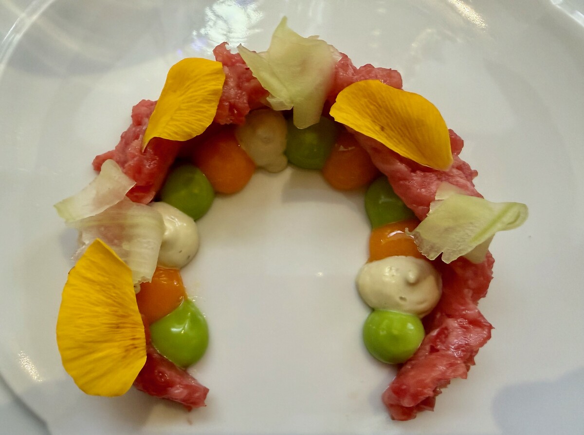 Come sarà la sua partita ce lo dirà il tempo. I primi assaggi però, fatti durante un pranzo stampa, lasciano ben sperare. Il percorso, caratterizzato da gusti che evidenziano una generale tendenza al dolce, comincia con la Tartare di Fassona, emulsione di tuorlo marinato, salsa tartara e sedano agrodolce: piatto riuscito, che potrebbe però avere una ancor migliore risonanza se il taglio della carne fosse più rustico, rendendola così capace di giocare in modo maggiormente efficace con le salse che la accompagnano.