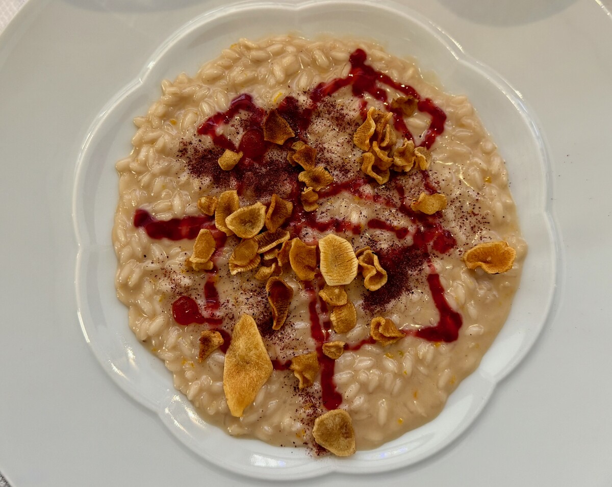 Il Risotto ispirato al “Tamango”, è forse la proposta più centrata del pasto: cottura perfetta, mantecatura precisa, nota acidulo-amara dell’hibisco ben gestita; forse solo la riduzione di arancia rischia di alterare leggermente l’equilibrio del tutto.