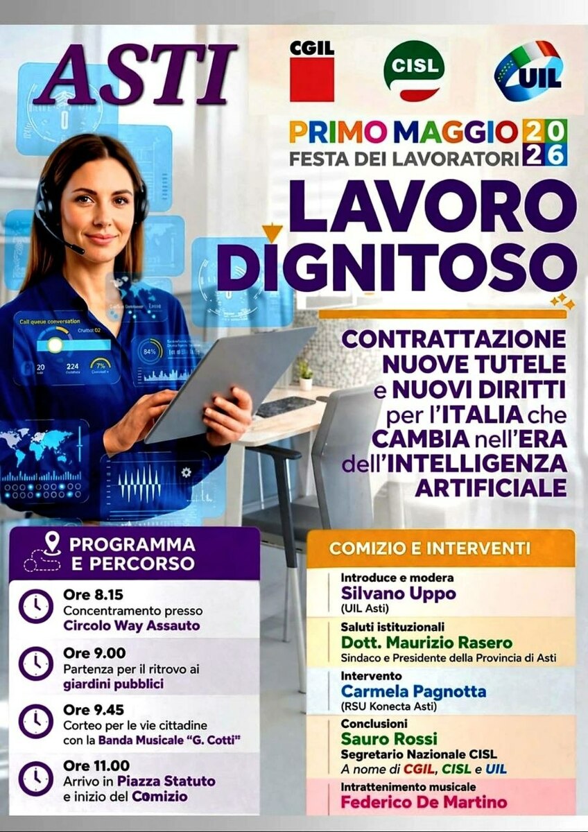 In un panorama economico segnato da rapide evoluzioni tecnologiche e crescenti incertezze, la celebrazione del Primo Maggio 2026 ad Asti assume un significato profondo e attuale. Le sigle sindacali CGIL, CISL e UIL hanno scelto di rimettere al centro della scena il concetto di “Lavoro Dignitoso”, proponendolo come l'unico antidoto efficace contro la precarietà e l'insidia dei contratti pirata. La giornata non vuol essere solo un momento di festa, ma una occasione per rivendicare con fermezza nuove tutele capaci di proteggere i lavoratori nell'era dell'Intelligenza Artificiale.